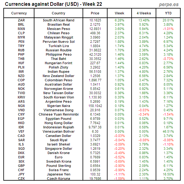 Divisas frente USD: Semana 22