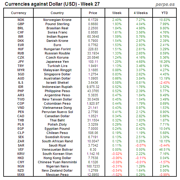 Divisas frente USD: Semana 27