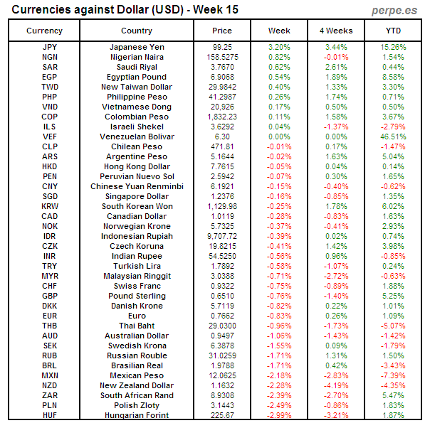 Divisas frente USD: Semana 15