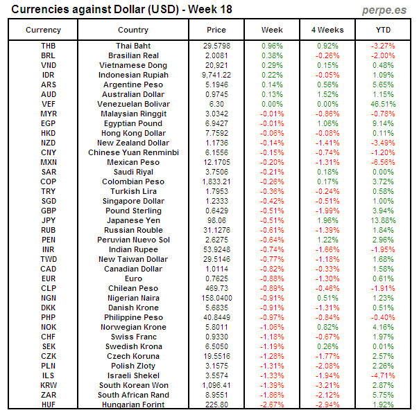 Divisas frente USD: Semana 18