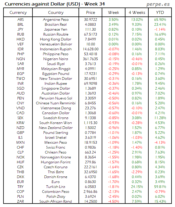 Divisas frente USD: Semana 34