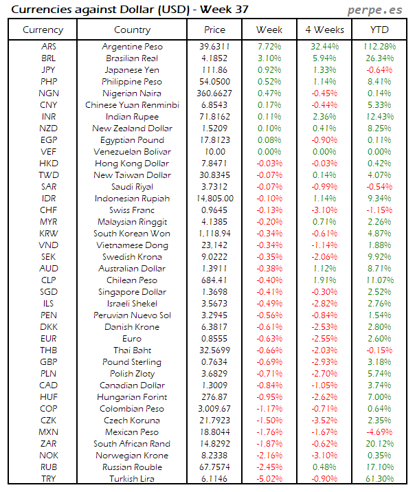 Divisas frente USD: Semana 37