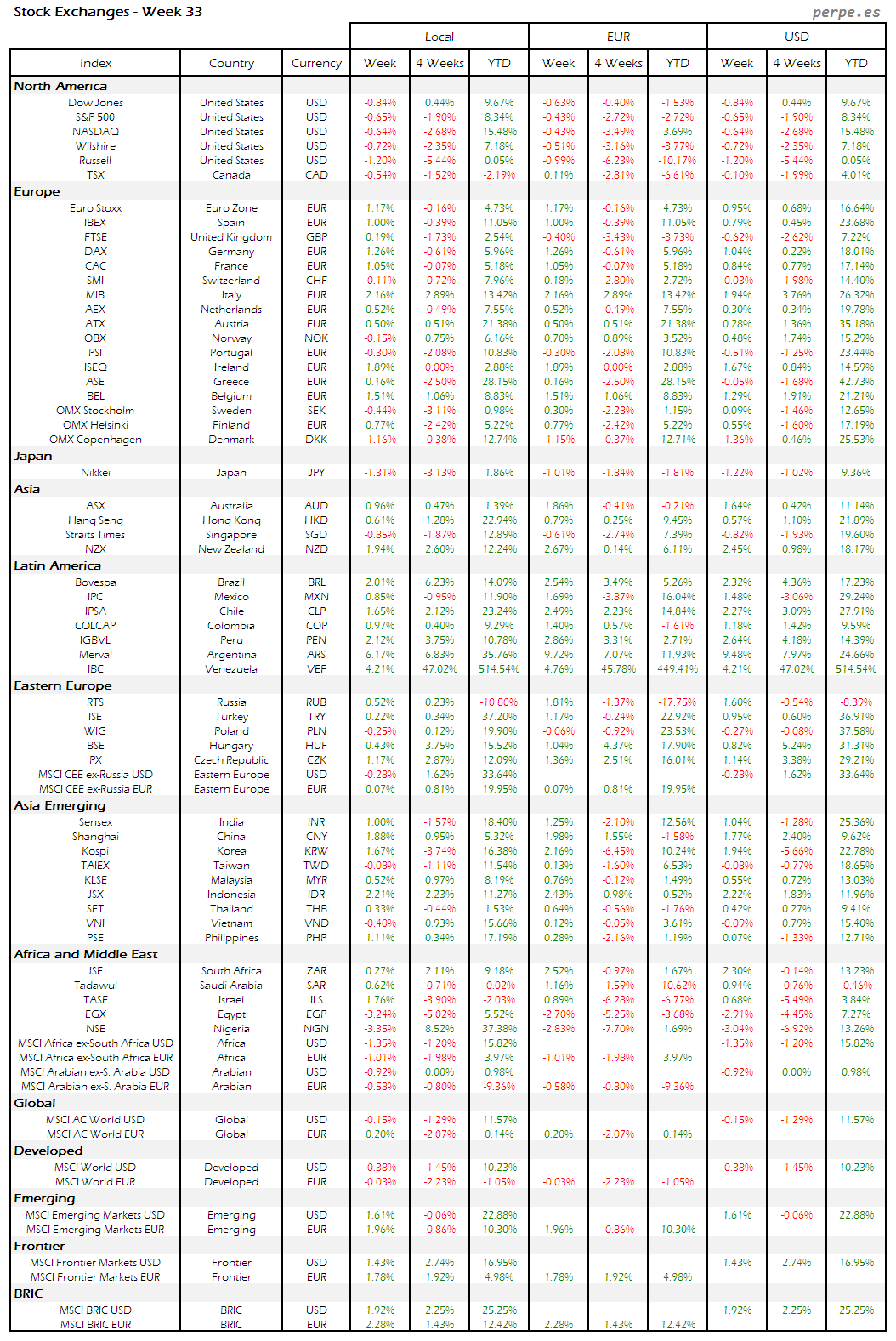 Bolsas Mundiales – Moneda Local, EUR, USD: Semana 33