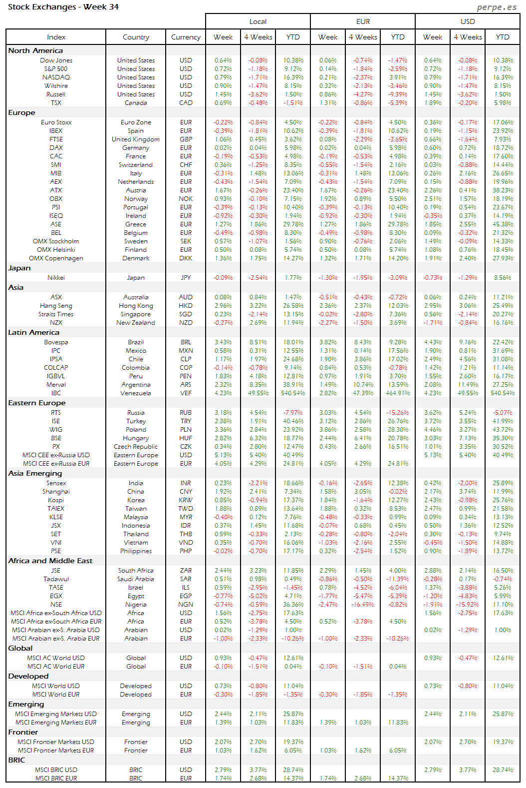Bolsas Mundiales – Moneda Local, EUR, USD: Semana 34