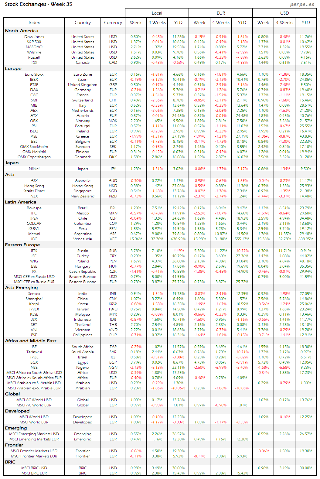 Bolsas Mundiales – Moneda Local, EUR, USD: Semana 35