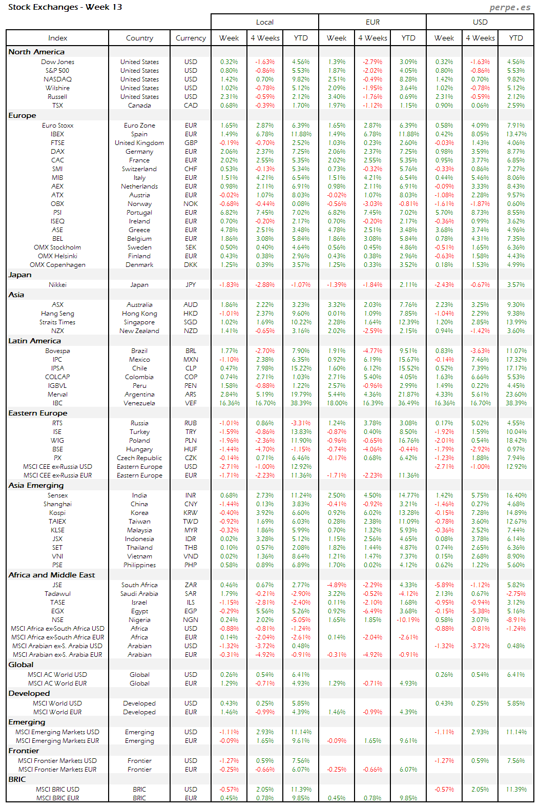 Bolsas Mundiales – Moneda Local, EUR, USD: Semana 13
