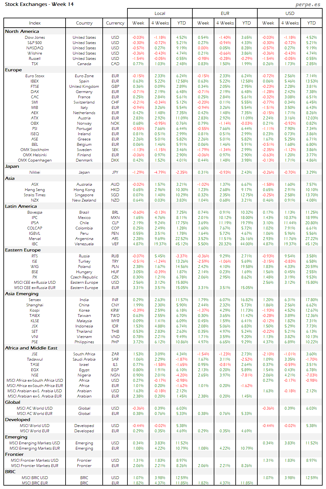 Bolsas Mundiales – Moneda Local, EUR, USD: Semana 14