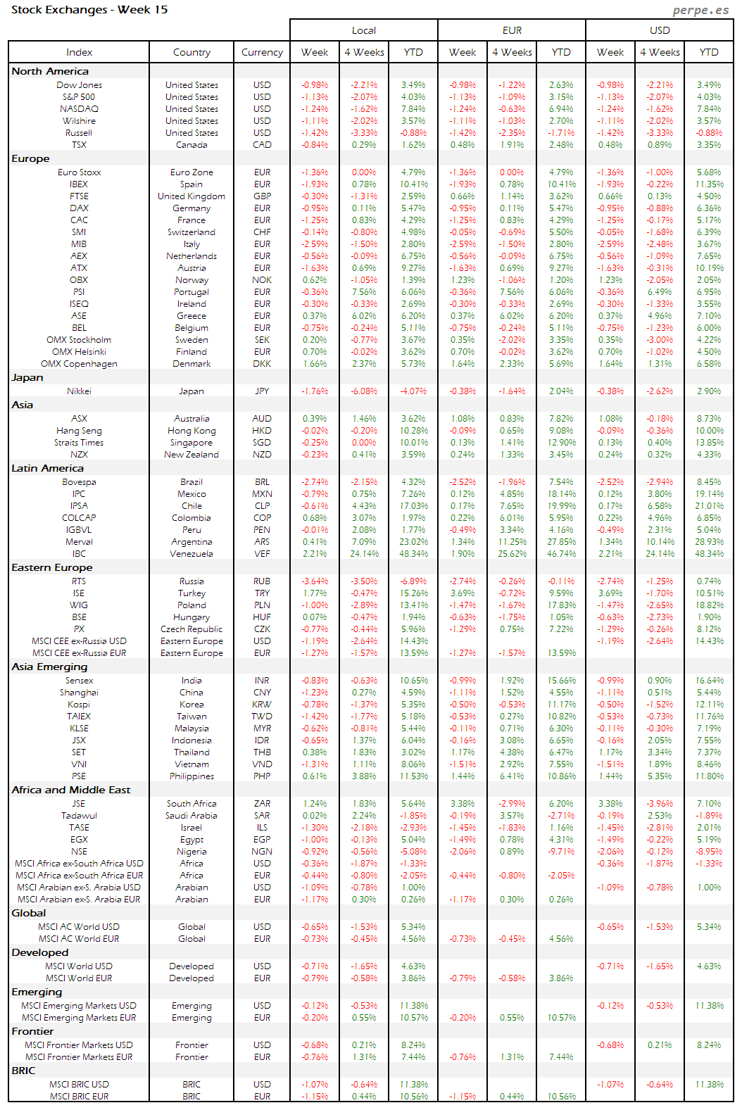 Bolsas Mundiales – Moneda Local, EUR, USD: Semana 15