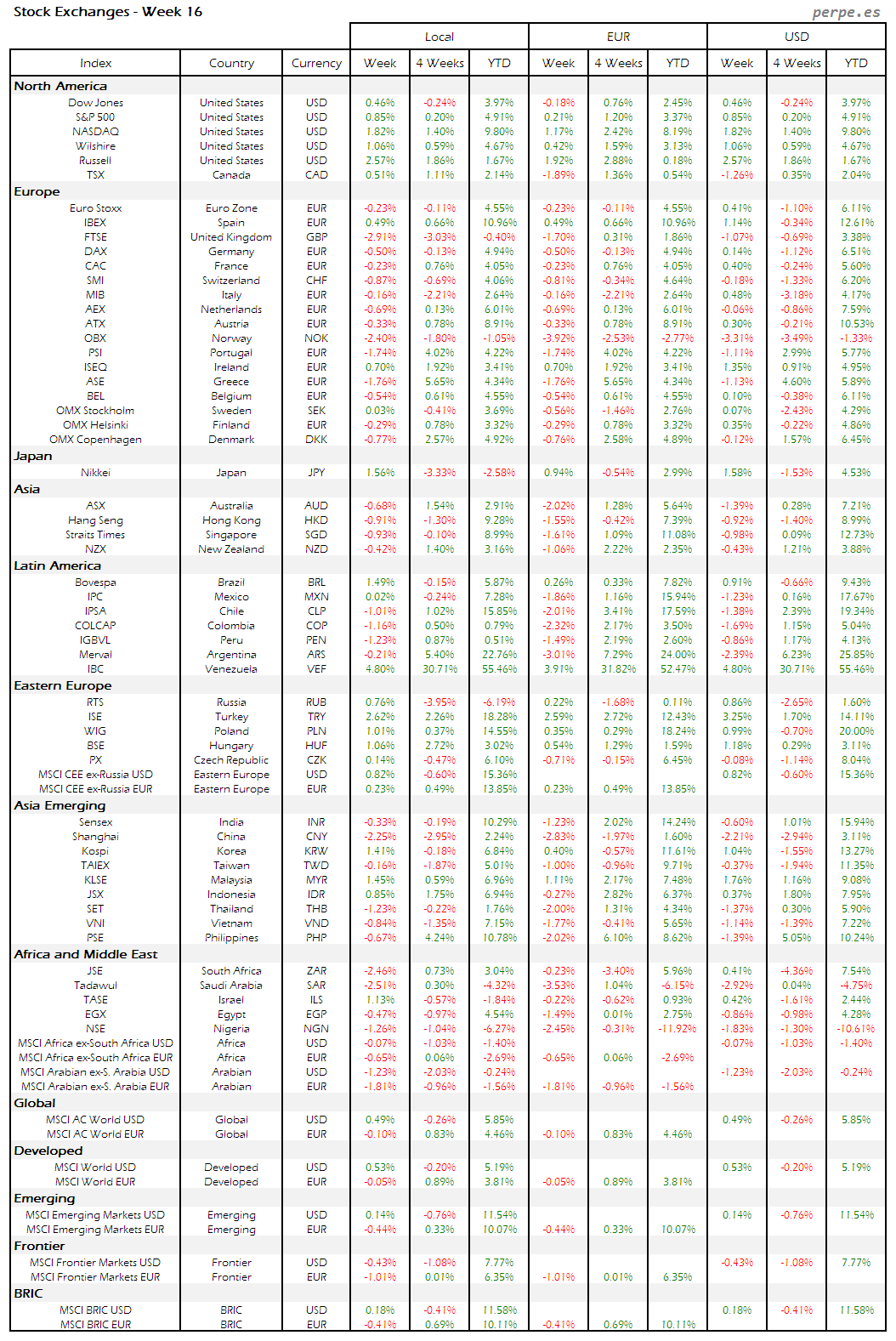Bolsas Mundiales – Moneda Local, EUR, USD: Semana 16