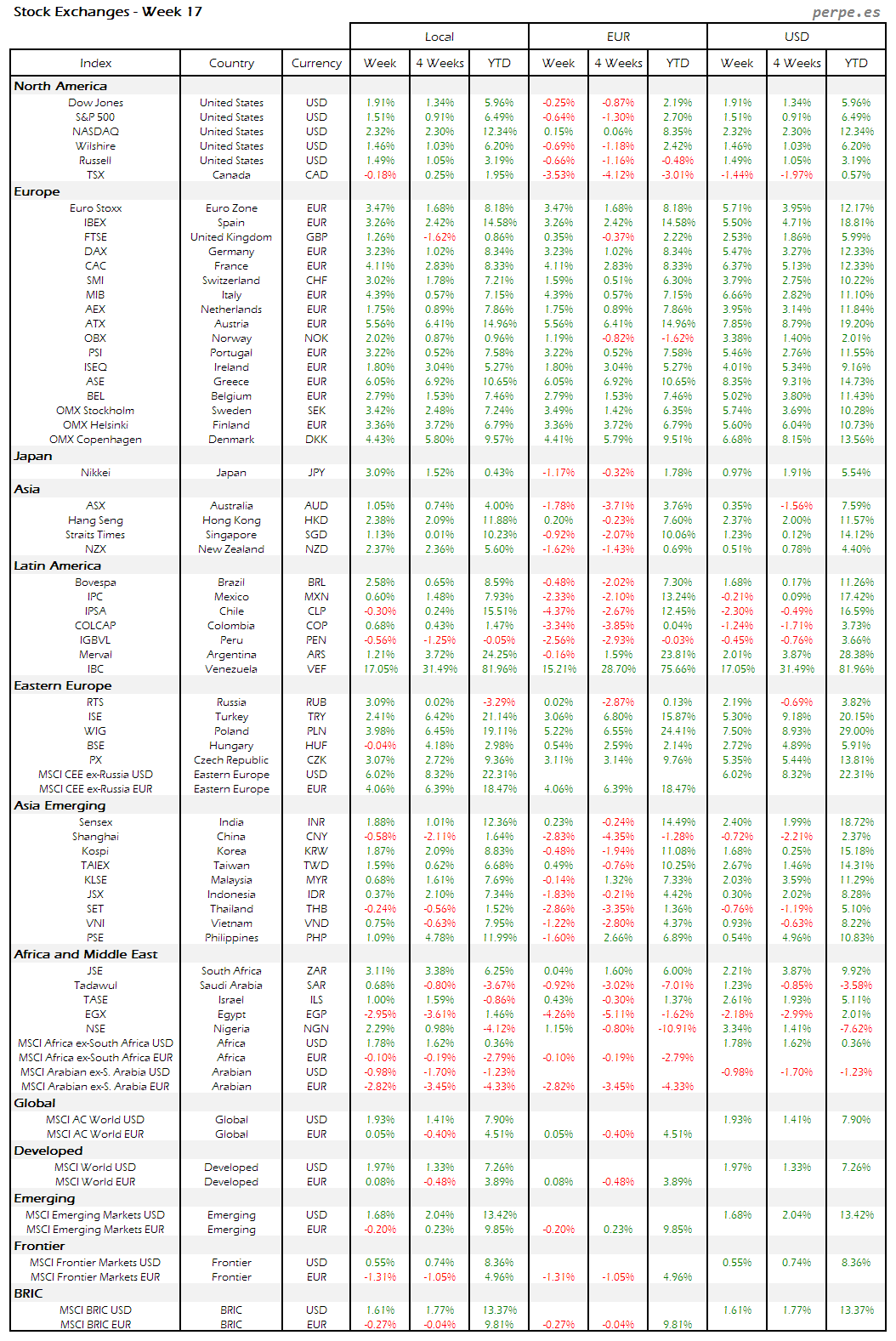 Bolsas Mundiales – Moneda Local, EUR, USD: Semana 17
