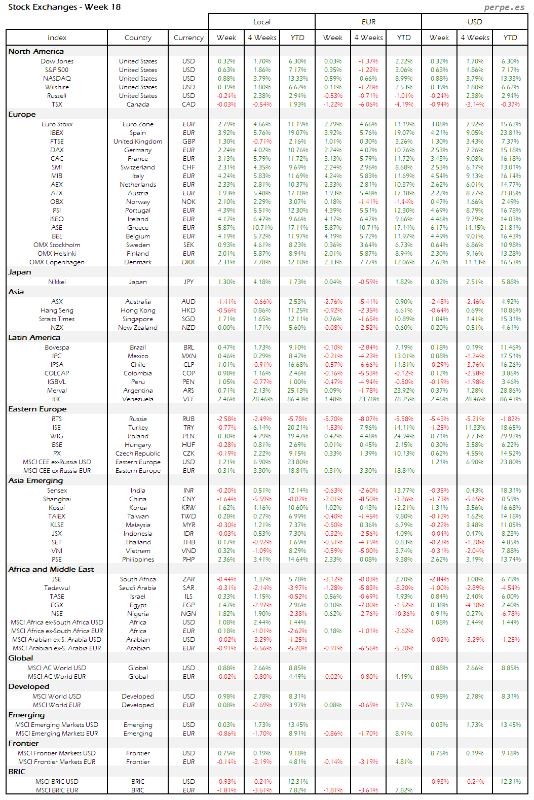 Bolsas Mundiales – Moneda Local, EUR, USD: Semana 18
