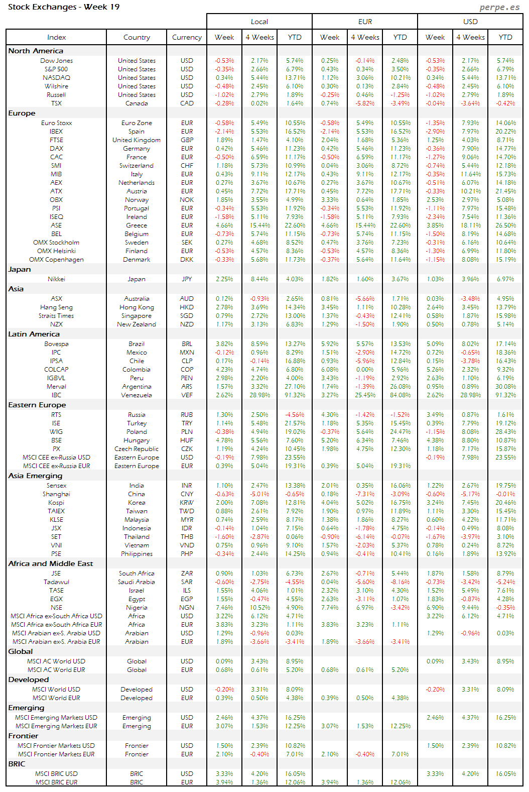 Bolsas Mundiales – Moneda Local, EUR, USD: Semana 19