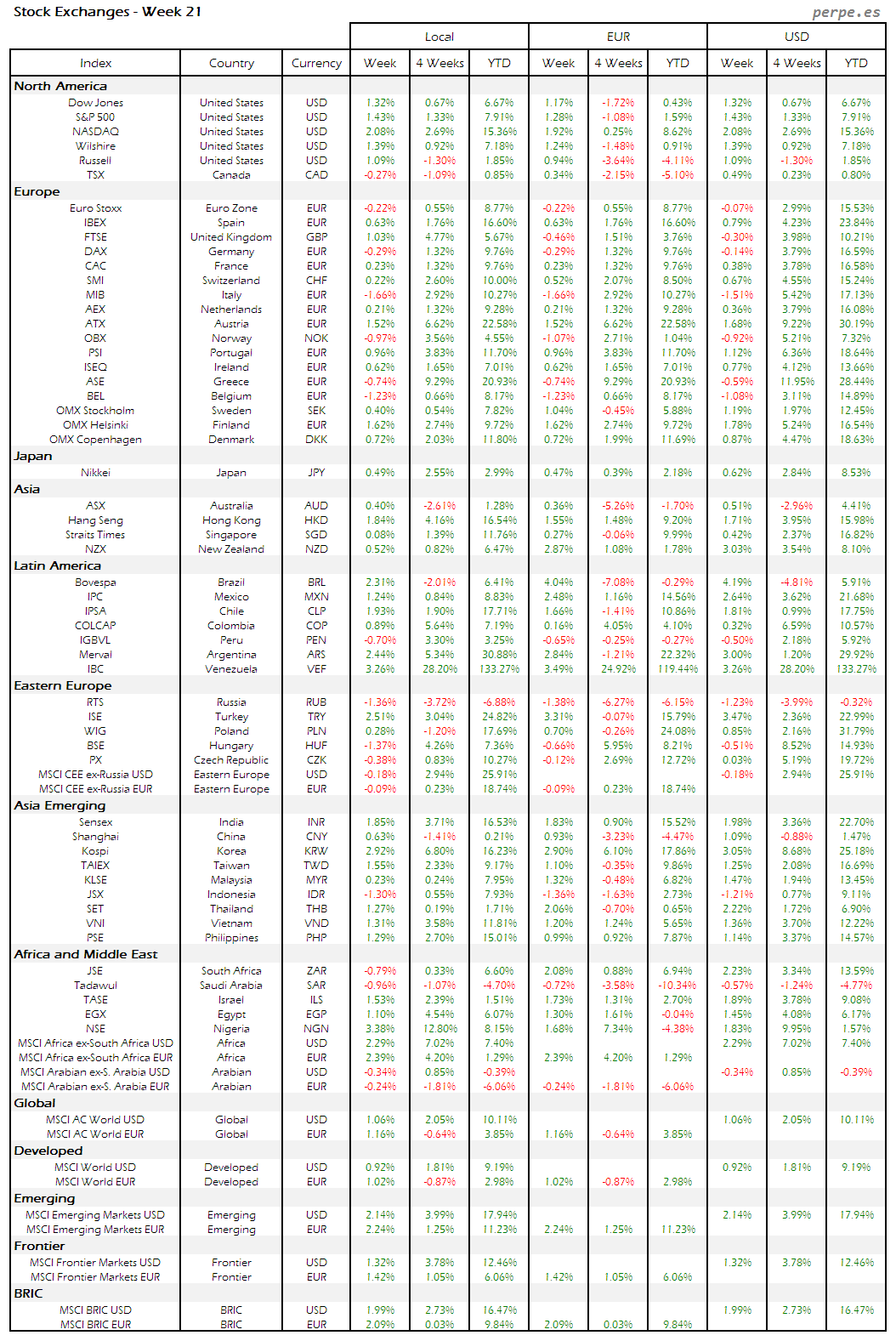 Bolsas Mundiales – Moneda Local, EUR, USD: Semana 21