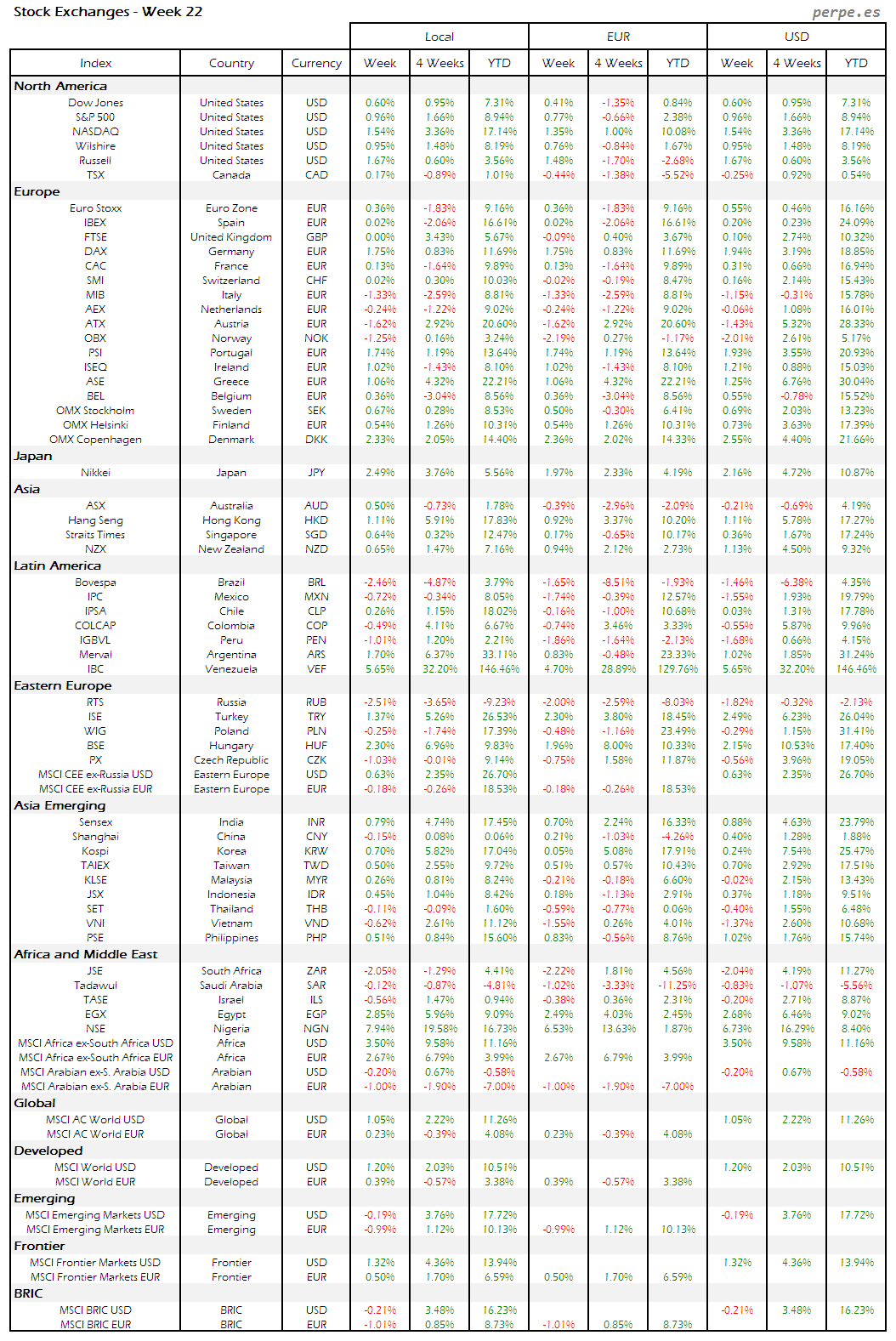 Bolsas Mundiales – Moneda Local, EUR, USD: Semana 22