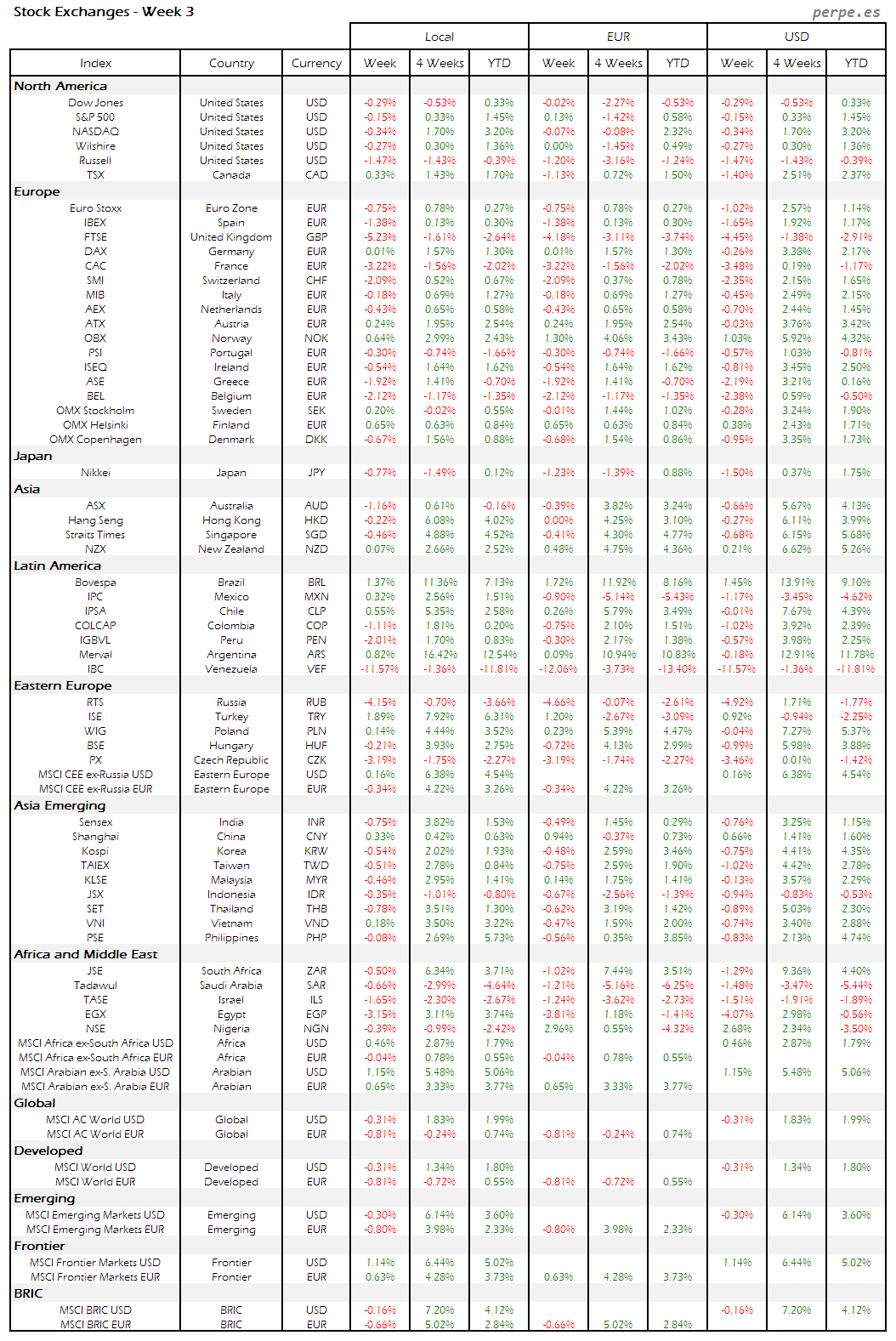 Bolsas Mundiales – Moneda Local, EUR, USD: Semana 3