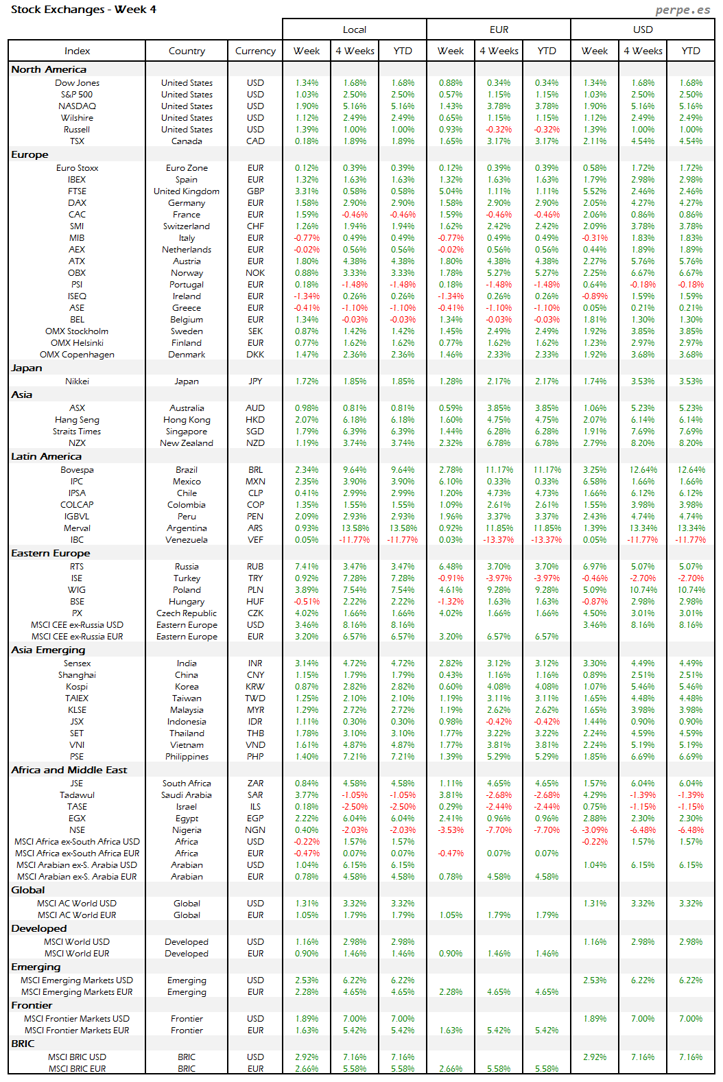 Bolsas Mundiales – Moneda Local, EUR, USD: Semana 4