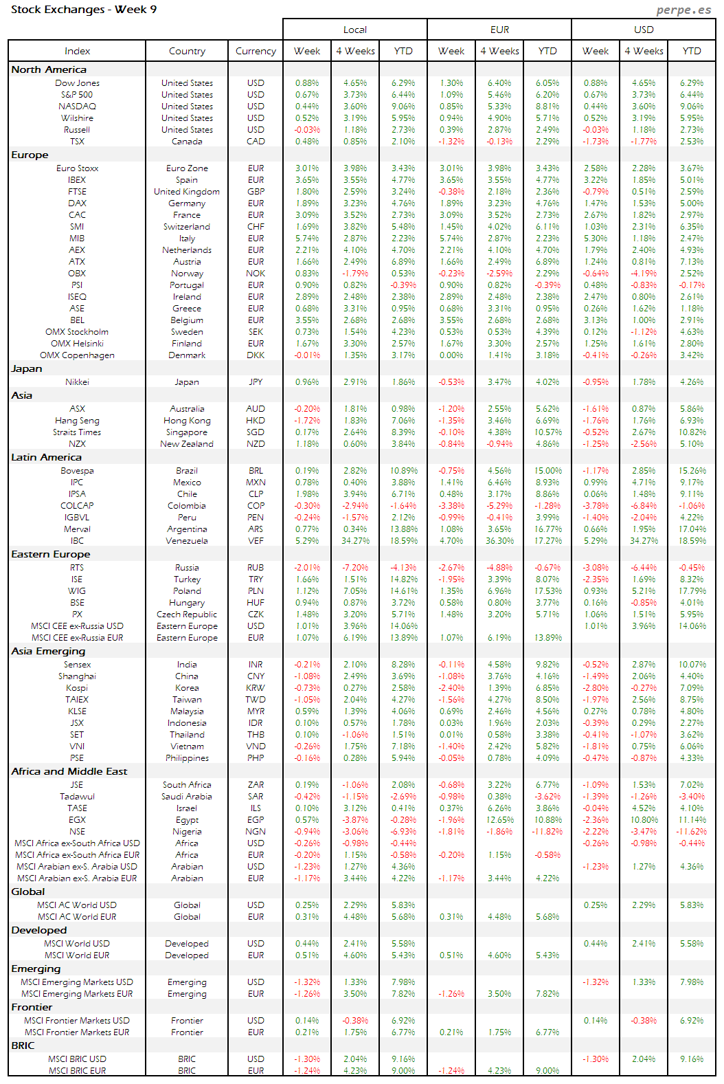 Bolsas Mundiales – Moneda Local, EUR, USD: Semana 9