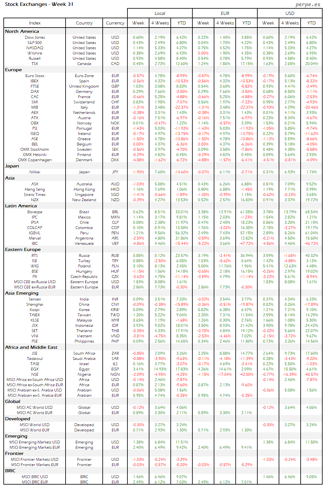 Bolsas Mundiales – Moneda Local, EUR, USD: Semana 31