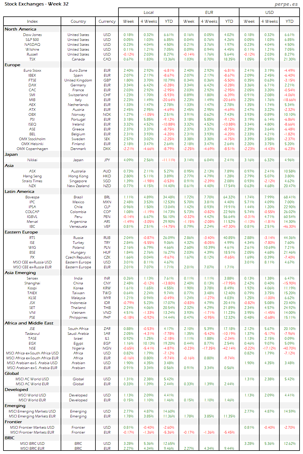 Bolsas Mundiales – Moneda Local, EUR, USD: Semana 32
