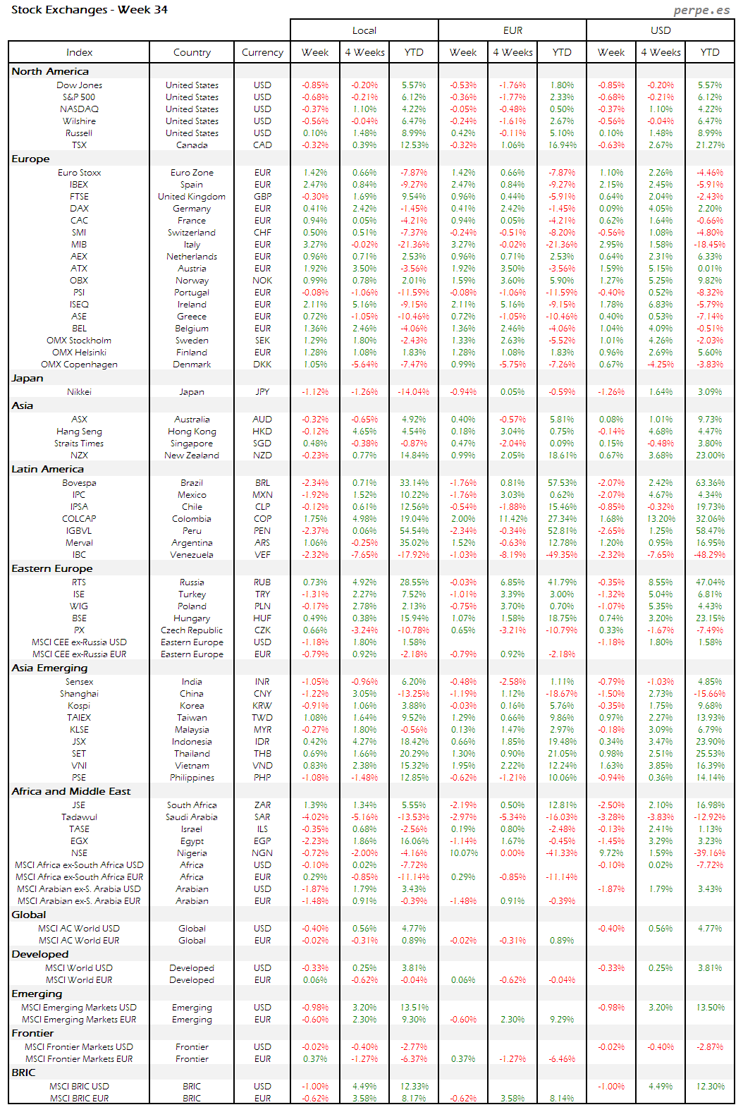 Bolsas Mundiales – Moneda Local, EUR, USD: Semana 34