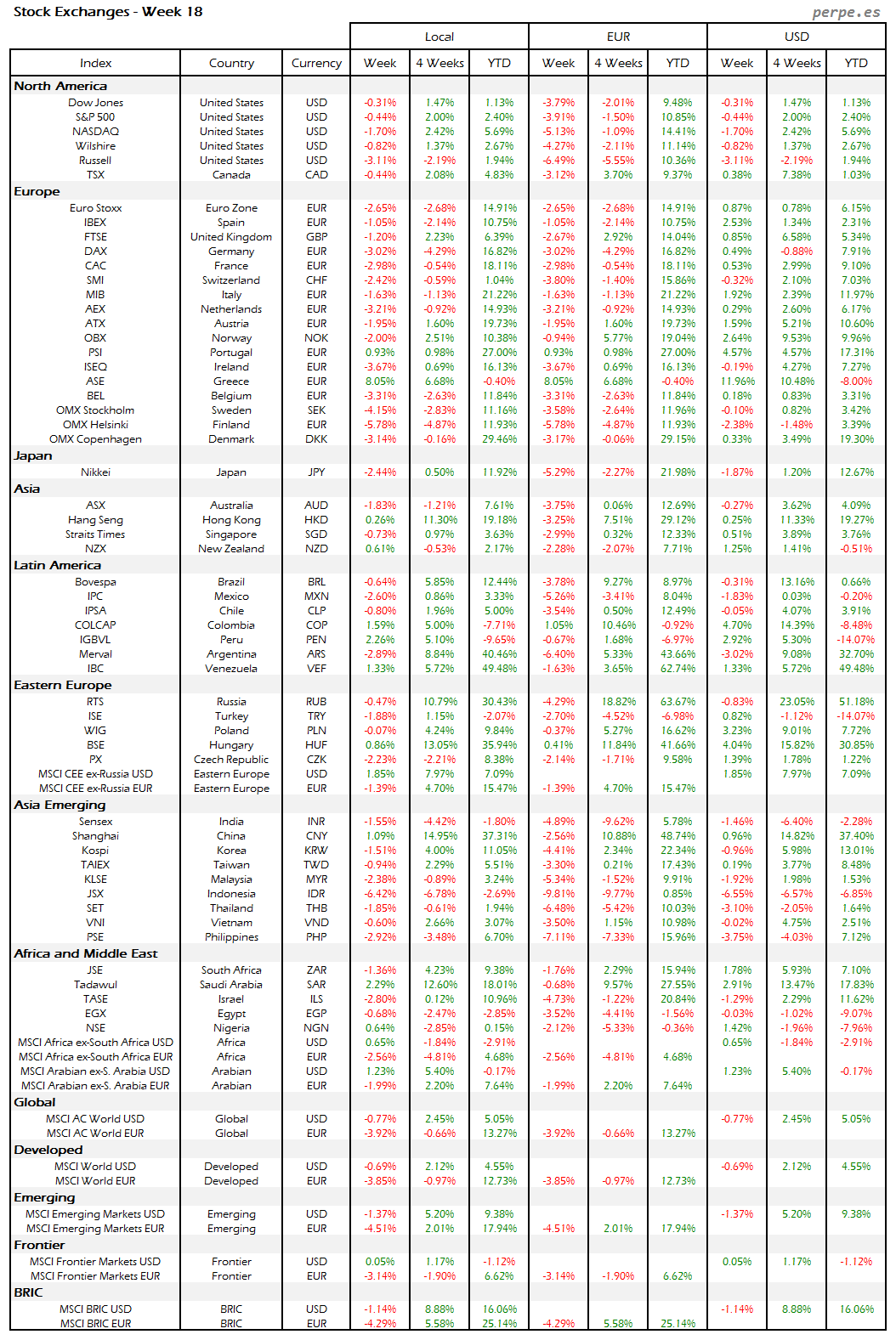 Bolsas Mundiales – Moneda Local, EUR, USD: Semana 18