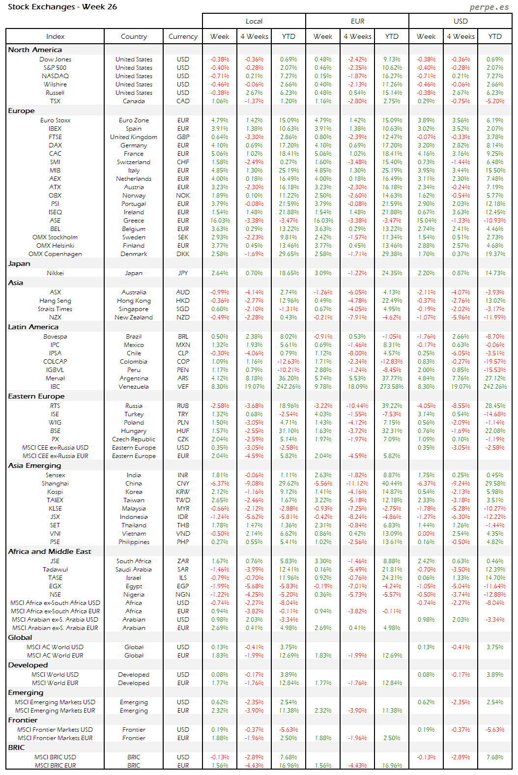 Bolsas Mundiales – Moneda Local, EUR, USD: Semana 26