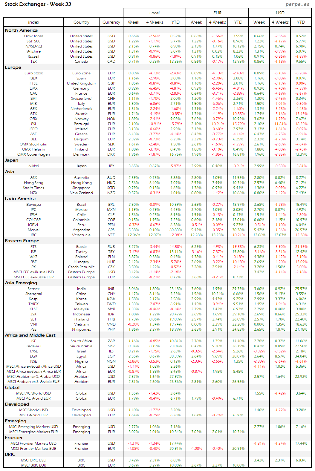 Bolsas Mundiales – Moneda Local, EUR, USD: Semana 33