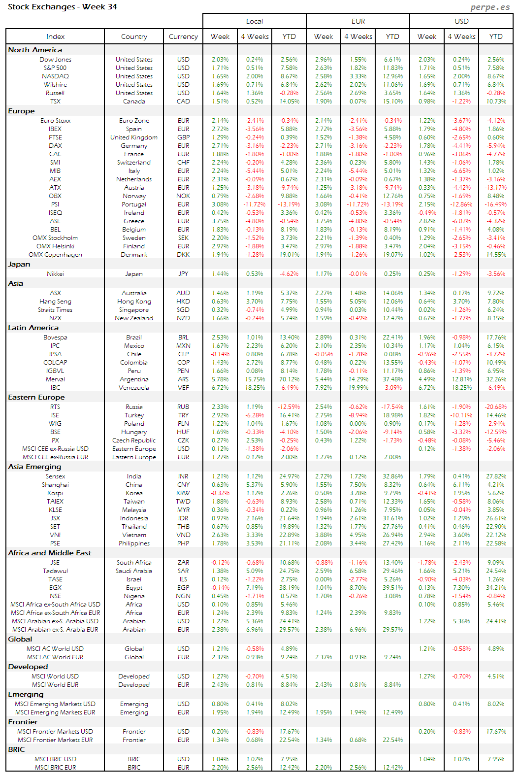 Bolsas Mundiales – Moneda Local, EUR, USD: Semana 34