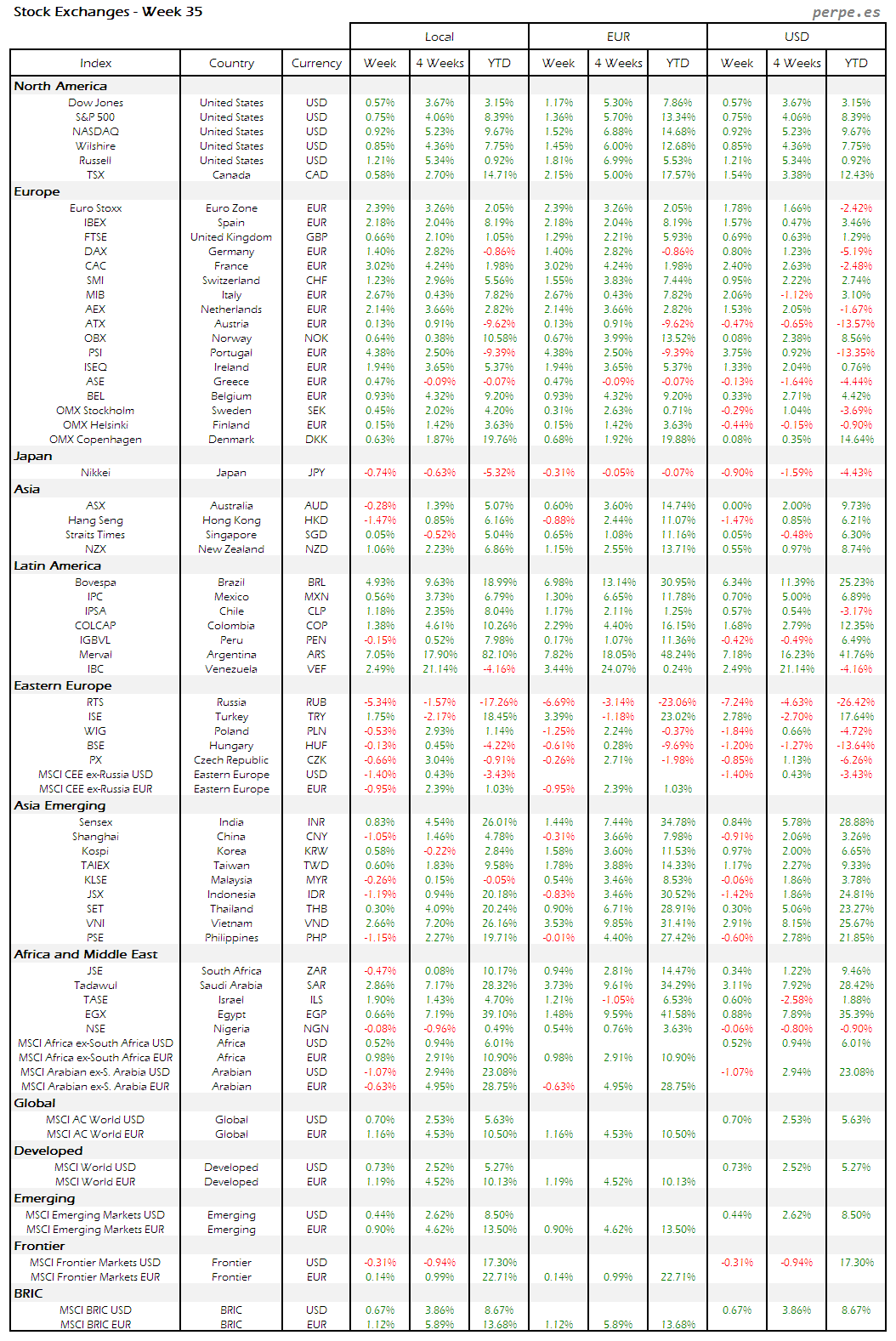Bolsas Mundiales – Moneda Local, EUR, USD: Semana 35