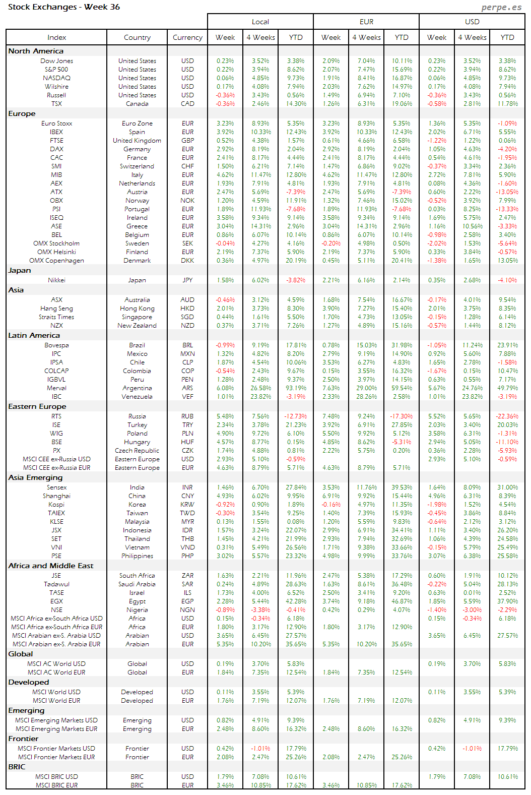 Bolsas Mundiales – Moneda Local, EUR, USD: Semana 36