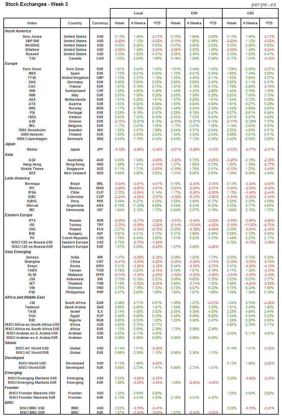 Bolsas Mundiales – Moneda Local, EUR, USD: Semana 3