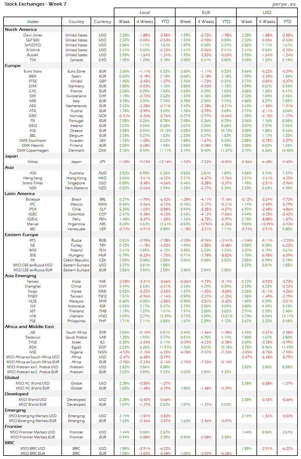 Bolsas Mundiales – Moneda Local, EUR, USD: Semana 7