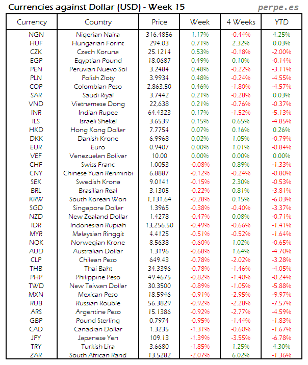 Divisas frente USD: Semana 15