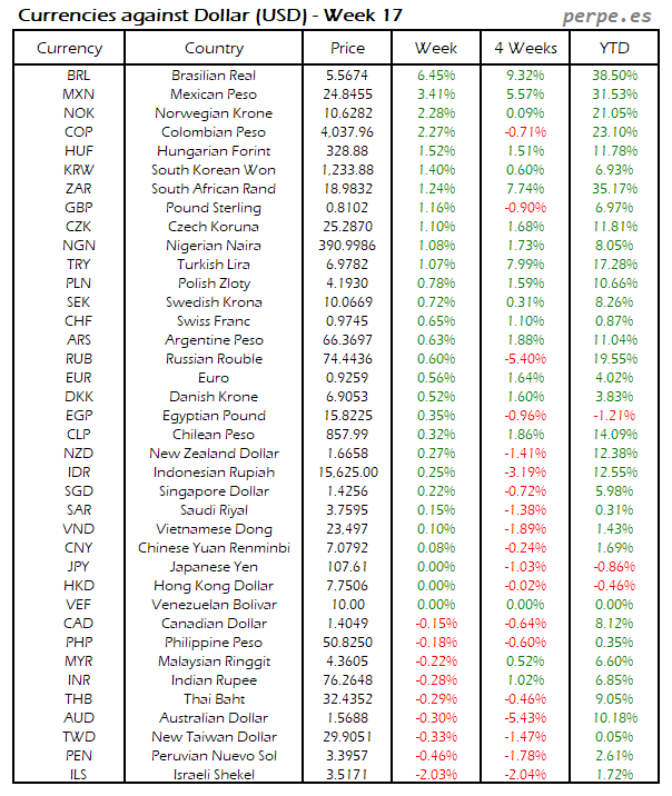 El dólar cayó 0.7% frente al euro, aunque este año se aprecia aún más del 3%. Real brasileño y peso mexicano entre las que más se aprecian esta semana frente al dólar, pero aún están entre las que más caen del mundo este año con casi 34% y 26% respectivamente. Yen se apreció por tercera semana consecutiva y está entre las pocas divisas que sube en lo que va de año. Alrededor del 0.4% subió esta semana el yuan, que cae algo más del 1% en el acumulado anual.