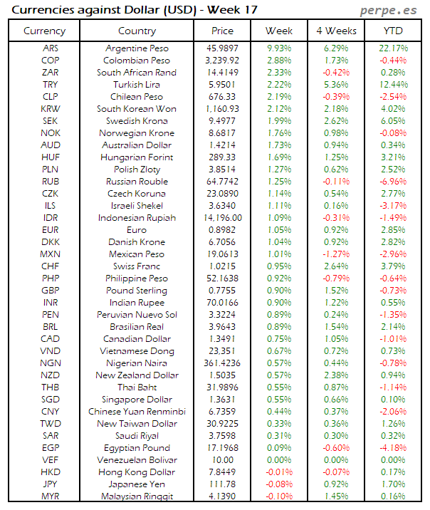 Divisas frente USD: Semana 17
