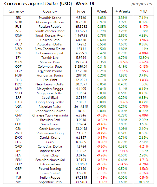 Divisas frente USD: Semana 18
