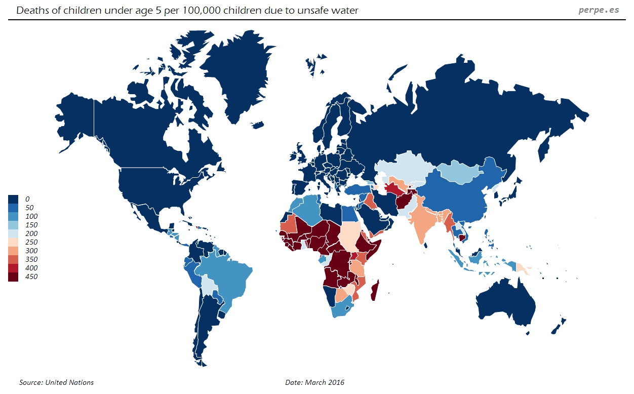 Aún más trágicos son los fallecimientos de los más débiles, los niños menores de 5 años, por la carencia o falta de salubridad de agua. En Sierra Leona, Afganistán, Níger y Burundi aún mueren más de 1,000 niños que no han cumplido los 5 años. Camboya es el segundo país no africano entre los 15 primeros en el que aún fallecen más de 600 menores.
