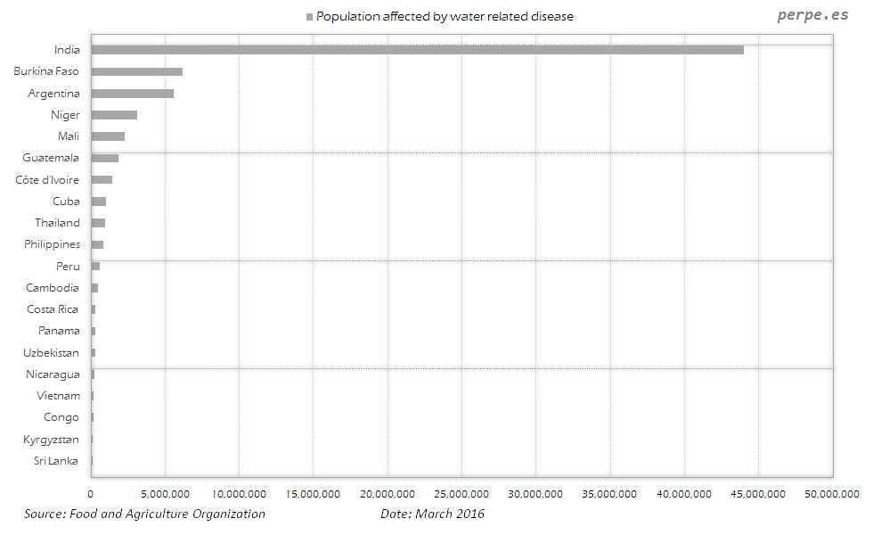 Por desgracia, todavía en muchos países emergentes millones de personas padecen enfermedades relacionadas con la contaminación del agua. Entre los pocos que publican datos, sólo algunos más de los que aparecen en la lista mostrada más abajo, India se sitúa a la cabeza con casi 45 millones de personas afectadas.