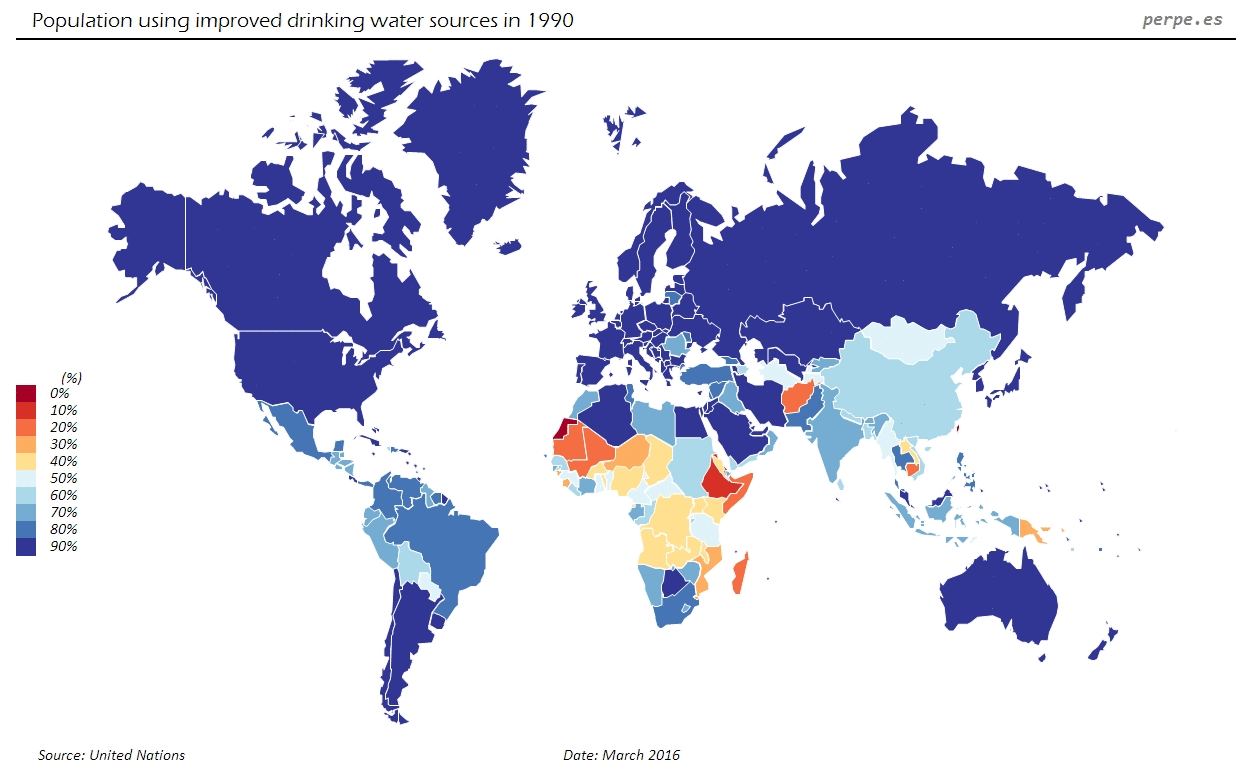 En Africa la población casi se ha duplicado desde entonces, pasando desde unos 630 millones de personas hasta cerca de 1,190 millones. El incremento en el acceso a agua potable ha sido superior, desde el 53% hasta un 69% actual en todo el continente.