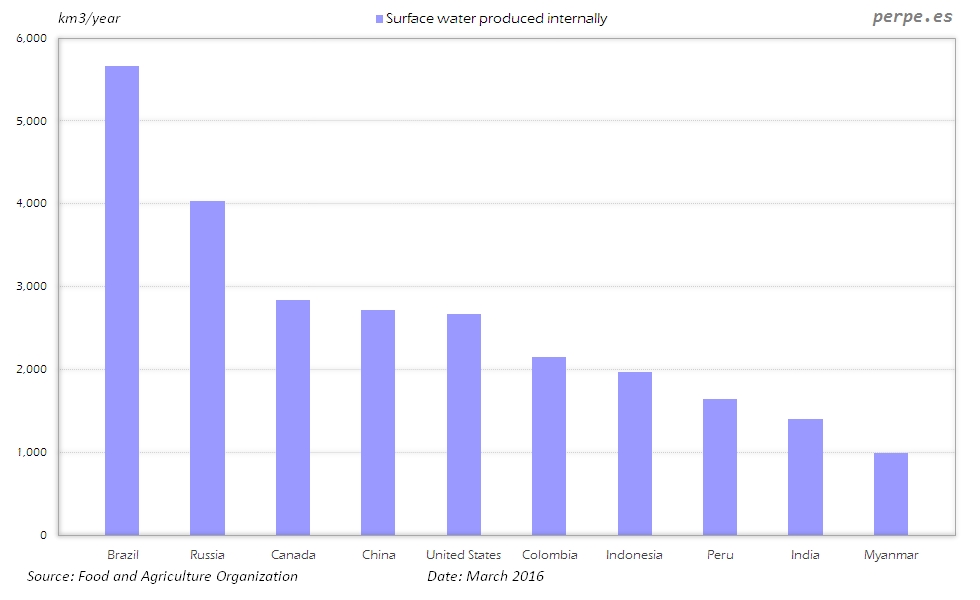 En los 10 principales países se localizan un 63% del total de aguas superficiales. Asimismo, en conjunto Estados Unidos, China, Rusia y Brasil contienen algo más de la tercera parte de las aguas subterráneas globales.