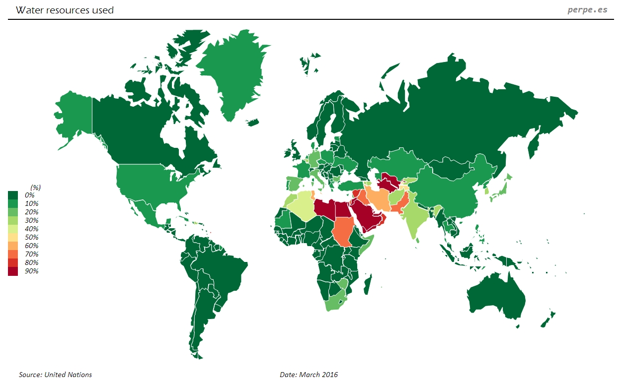 Como no podía ser de otra manera, todos los países de Oriente Medio junto con Libia y Sudán tienen el ratio más alto de utilización, superando ampliamente el 100%, de manera que necesitan unas entradas de unos 300 km3 de aguas superficiales y 14 km3 de aguas subterráneas en promedio anual a largo plazo.
