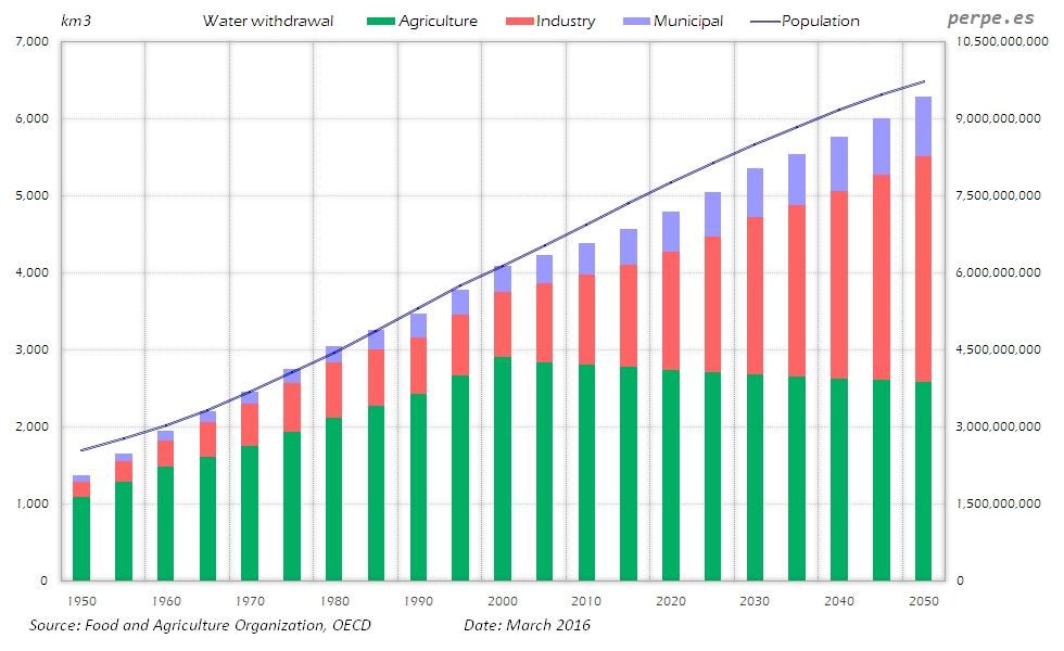 Considerando niveles de uso per cápita relativamente constantes en las próximas décadas, el aumento que se espera en unos 2,400 millones de personas hasta el año 2050, produciría que se sobrepasaran los 6,000 km3 en la extracción de agua, a pesar de que se estima una reducción desde el 70% actual que se destina a la agricultura hasta aproximadamente un 40%. Por el contrario, en industria la utilización sería un 120% superior a la actual, mientras que en uso municipal las estimaciones apuntan a un aumento anual del 1.4%, si bien en este último caso parecen algo reducidas.