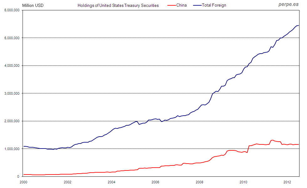 Deuda pública en manos de extranjeros y China en Estados Unidos desde 2000 / Foreign and China holdings of United States Treasury securities since 2000 Posted 11 December, 2012 by perpe