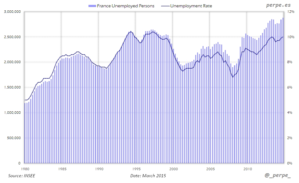 Desempleados y tasa de desempleo en Francia desde 1980 / Unemployed and unemployment rate in France since 1980 Posted 26 March, 2015 by perpe