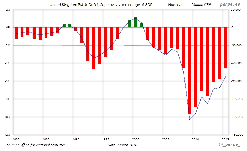 Déficit presupuestario en Reino Unido desde 1980 / Budget deficit in United Kingdom since 1980 Posted 13 March, 2016 by perpe