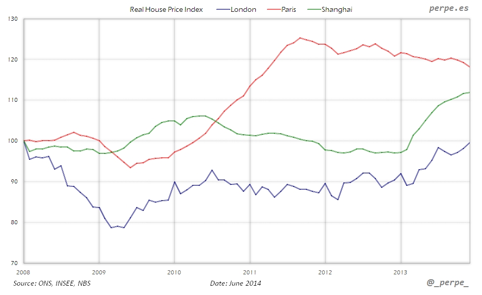 Precio real de la vivienda en Londres, París y Shanghai desde 2008 / Real house price in London, Paris and Shanghai since 2008 Posted 10 June, 2014 by perpe
