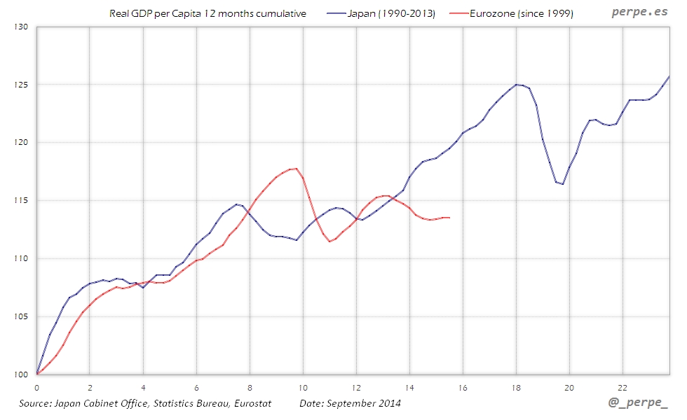 PIB per cápita en la Zona Euro desde 1999 y Japón entre 1990 y 2013 / GDP per capita in Euro Zone since 1999 and Japan between 1990 and 2013 Posted 2 September, 2014 by perpe