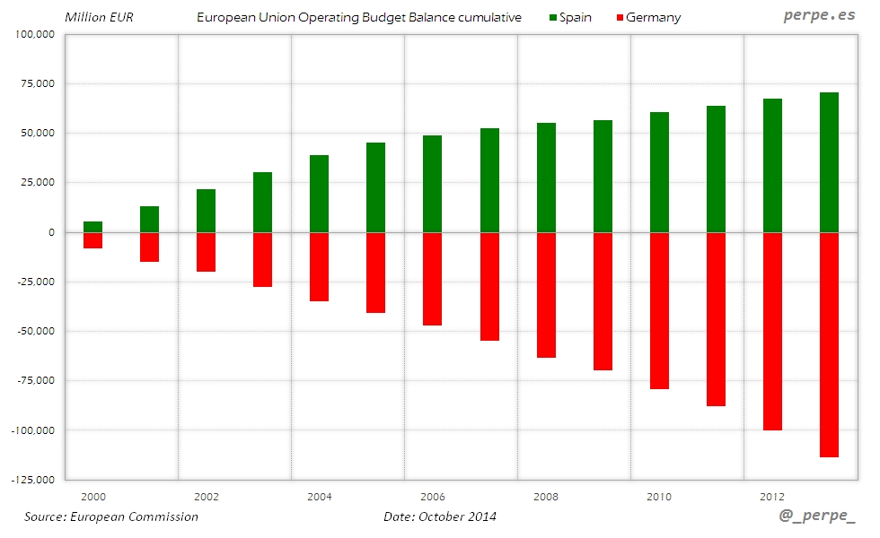 Saldo presupuestario de la Unión Europea en España y Alemania desde 2000 / Budget balance of the European Union in Spain and Germany since 2000 Posted 21 October, 2014 by perpe