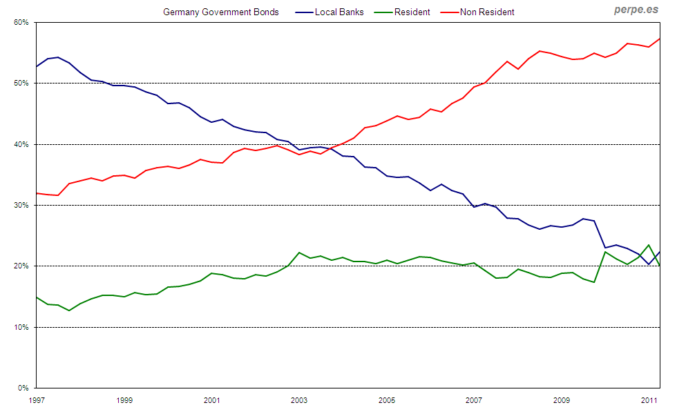 Deuda pública en manos de bancos, residentes y no residentes en Alemania desde 1997 / Banks, residents and non residents holdings of public debt in Germany since 1997 Posted 9 October, 2012 by perpe