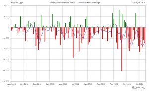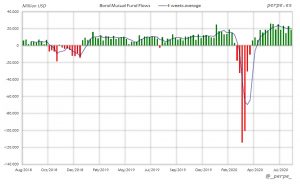 Suscripciones en fondos y ETF’s de renta variable después de 13 semanas de salidas producidas por los fondos domésticos. En el acumulado anual el saldo negativo es de 314.000 millones de dólares por encima de los 124.000 millones en las mismas fechas del año anterior.
